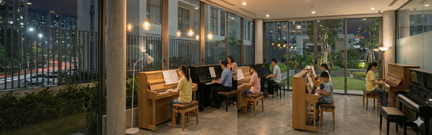 Không gian lớp học piano yên tĩnh, trang trọng, giúp học viên tập trung tối đa. Giáo viên giảng dạy tận tâm, kiên nhẫn, luôn khuyến khích học viên phát triển cảm xúc âm nhạc thay vì chỉ chơi đúng nốt.