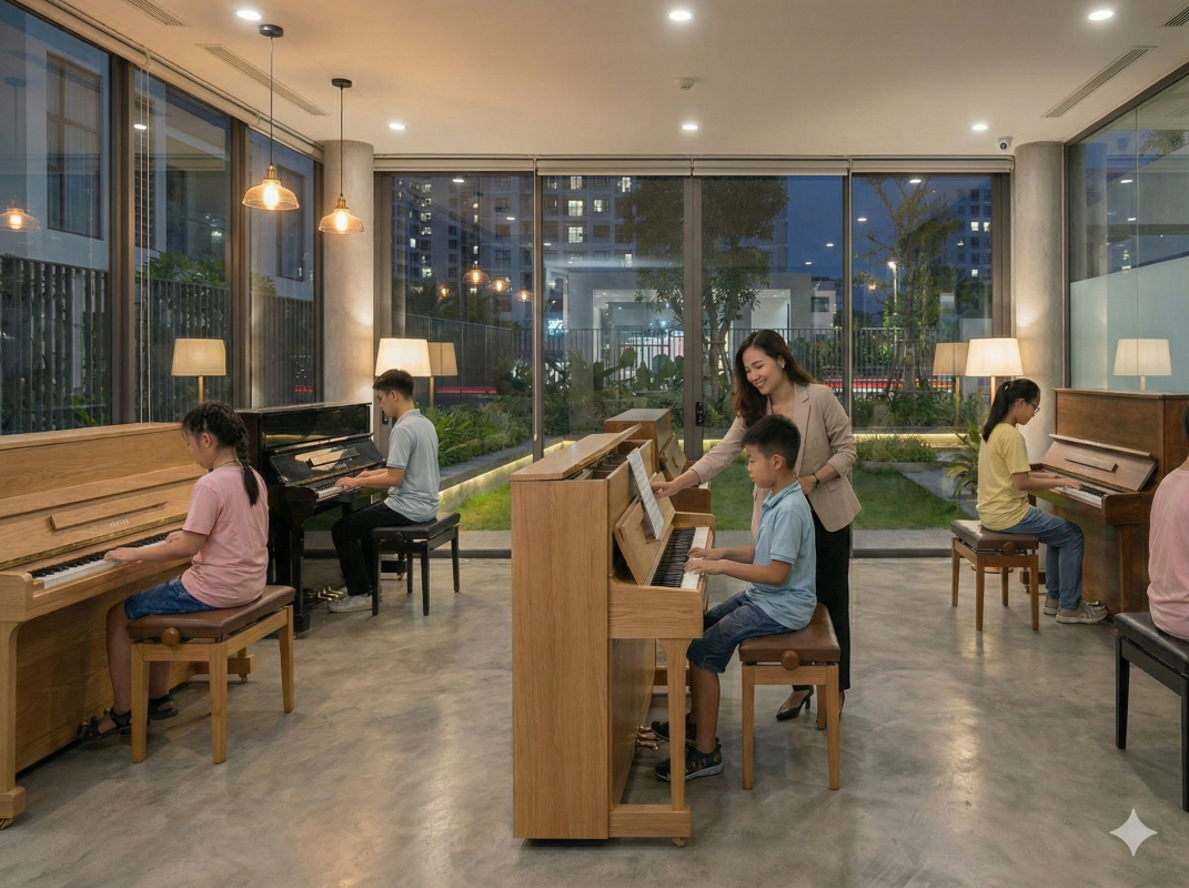Lớp dạy piano tại trung tâm được xây dựng với giáo trình rõ ràng, chia theo từng cấp độ, phù hợp cho trẻ em, người lớn và người mới bắt đầu.